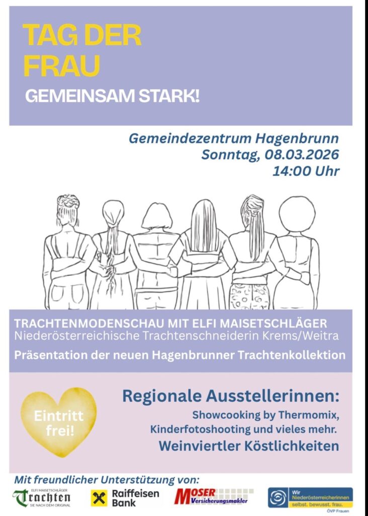 Am 8.3.2026 findet im Gemeindezentrum in  Hagenbrunn der „Tag der Frau“ statt. Ein Tag voller Inspiration, Begegnung und Wertschätzung – gestaltet für alle, die sich austauschen, stärken und Neues entdecken möchten.